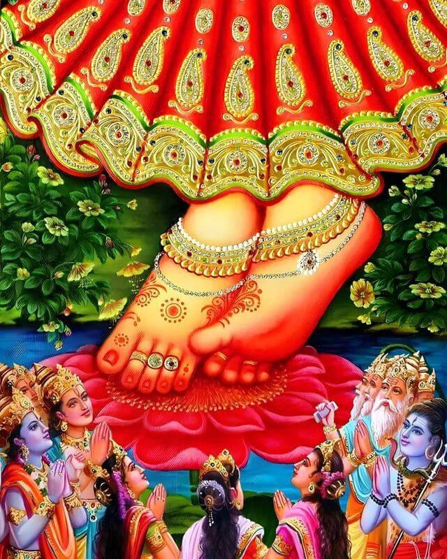 „Kaip debesyje pasirodęs žaibas džiaugsmingai griaudėja, taip ir mes garsiai skelbiame (udghoṣa): tik Šri Radhos Maharani galia mums pasiekiama ši amžinojo žaismo palaima (Nitya-Vihāra rasa).“